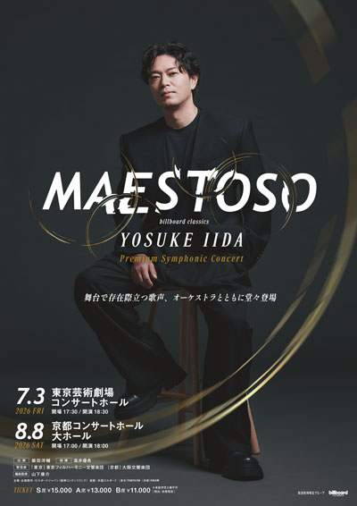コンサートのタイトルは『billboard classics YOSUKE IIDA Premium Symphonic Concert -MAESTOSO-』。音楽用語で“堂々とした”を意味する“MAESTOSO(マエストーゾ)”は、飯田自身が選んだ言葉だという。