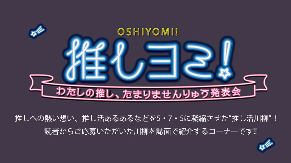 推しへの想いは詠んでみたいけど、誌面に掲載されるのはちょっと恥ずかしい.…… という方も、「推しヨミ!」への参加は大歓迎! 3つのハッシュタグが揃っていない川柳は、掲載対象外とさせていただきますのでご安心ください。「#推しヨミ」のハッシュタグを付けてポストすれば、きっと同じ想いの方とその気持を分かち合えるかも……!?