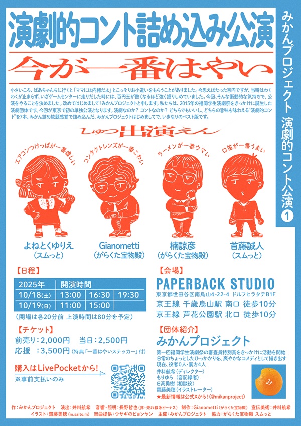 改めてはじめまして!みかんプロジェクトと申します。私たちは、2015年の福岡学生演劇祭をきっかけに誕生した演劇団体です。今回が東京で初の単独公演となります。演劇なのか? コントなのか? どちらでもいいし、どちらの旨味も味わえる“演劇的コント”を7本、みかん詰め放題感覚で詰め込んだ、みかんプロジェクトはじめましてで、いきなりのベスト版です。