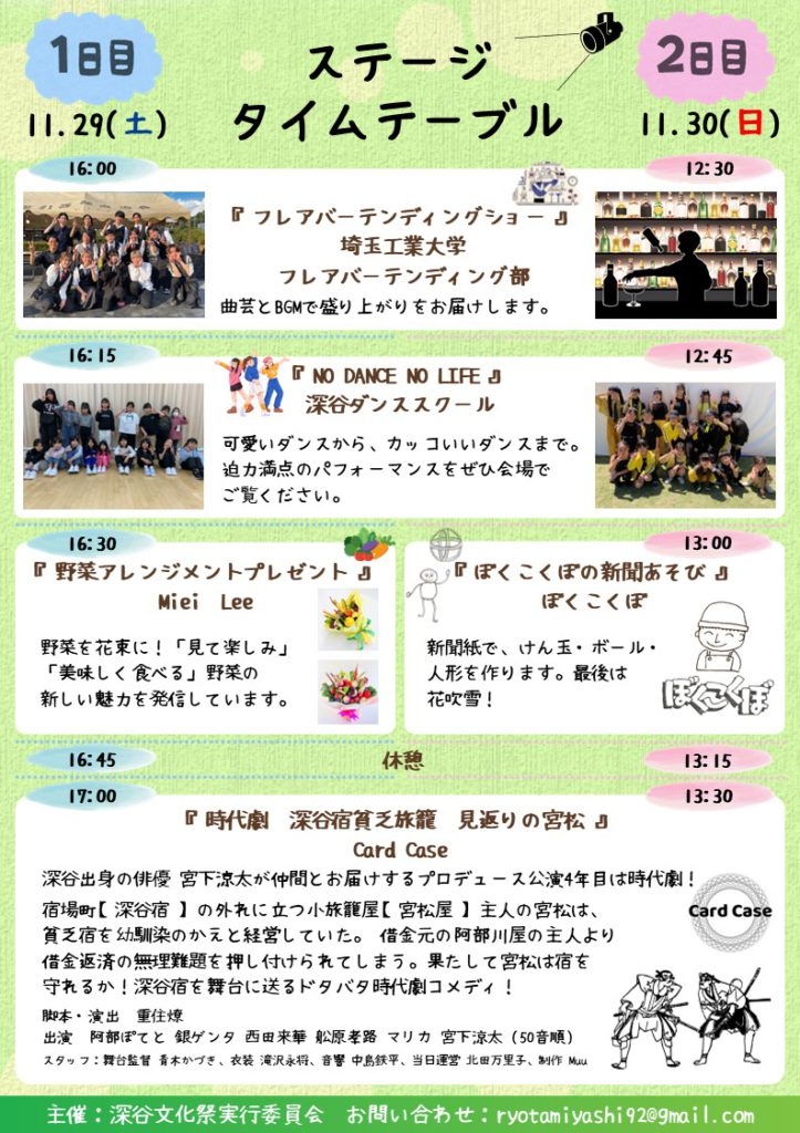 埼玉工業大学 フレアバーテンディング部さん・深谷ダンススクールさん・野菜アレンジメントMieiさん・ぼくこくぼさんにステージに出演いただき、劇団シナトラさん・メロウシアターさんにロビー展示にご参加いただく予定です。ご来場いただいた皆様にもご参加いただけるイベントも検討中です。