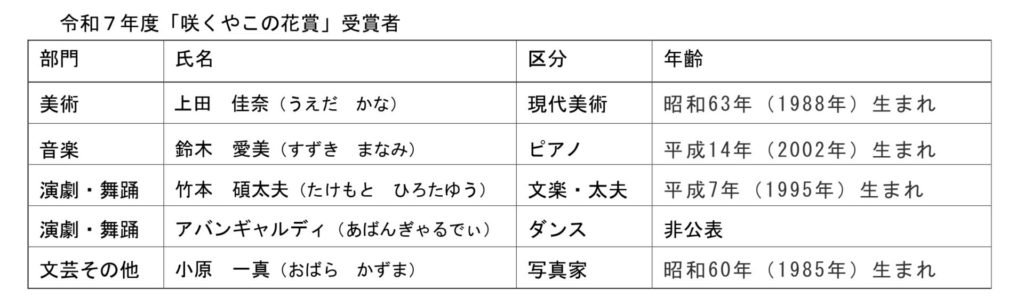 賞の対象は、「美術」「音楽」「演劇・舞踊」「大衆芸能」「文芸その他」の5部門、年齢はおおむね40歳以下としており、毎年、選考にかかる会議を経て決定します。