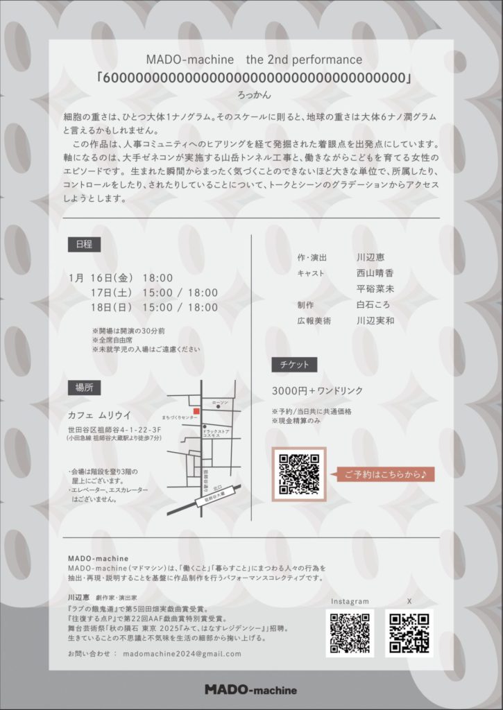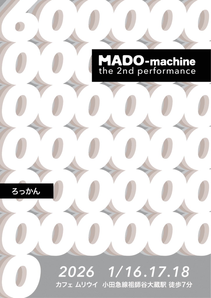 「働くこと」「暮らすこと」にまつわる人々の行為を抽出・再現・説明する行為を基盤に作品制作を行うパフォーマンスコレクティブMADO-machineの第二回公演『600000000000000000000000000000000000000(ろっかん)』が、2026年1月16日(金)から18日(日)まで東京・カフェ ムリウイ(祖師谷大蔵駅より徒歩7分)で上演される。