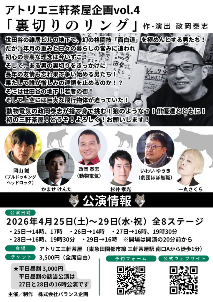 アトリエ三軒茶屋企画Vol.4『裏切りのリング』が、2026年4月25日(土)~29日(水・祝)にアトリエ三軒茶屋(東京都世田谷区三軒茶屋1丁目39-5 地下1階)にて上演されます。
