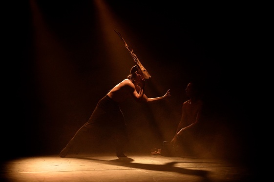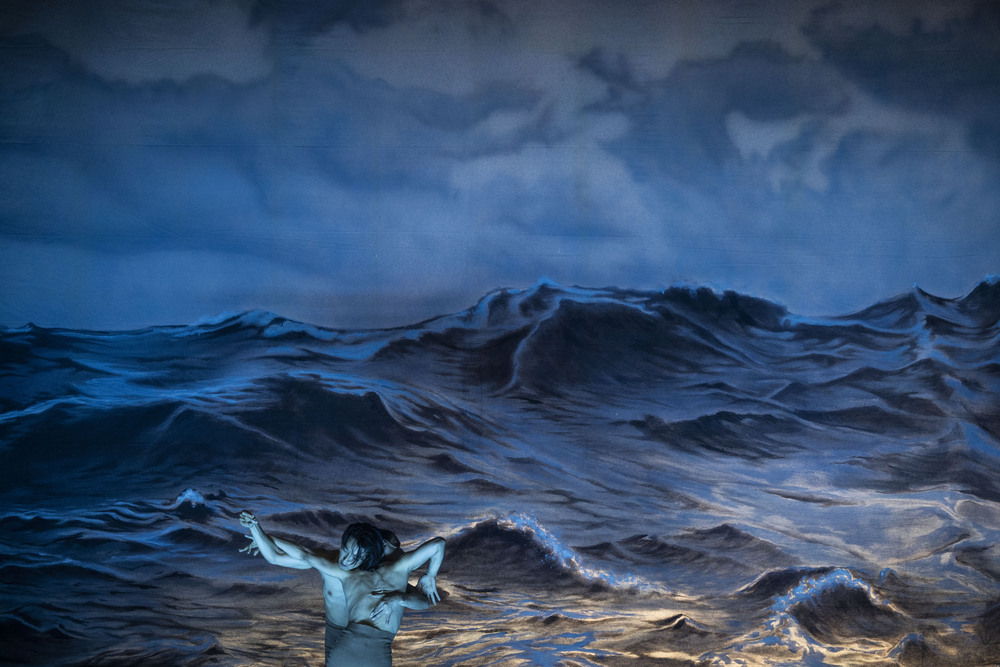 煙の向こうに揺れる波の絵。枝や根を思わせる仮面をまとったコーラスの声。二人のダンサーの肉体とささやきが、静かに空間を震わせる。