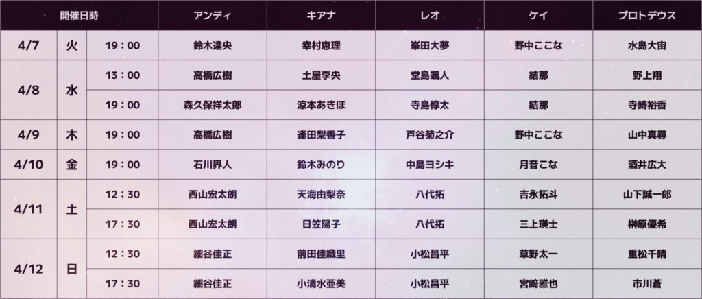 全9公演、5名のキャストと2人の演奏家によって上演されるが、演奏家は共通しているものの、キャストの顔ぶれは回ごとに異なる。