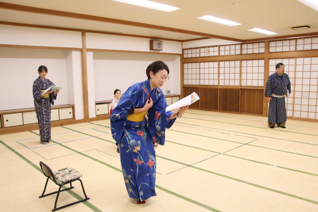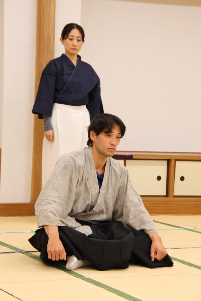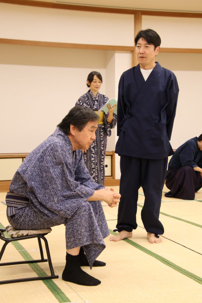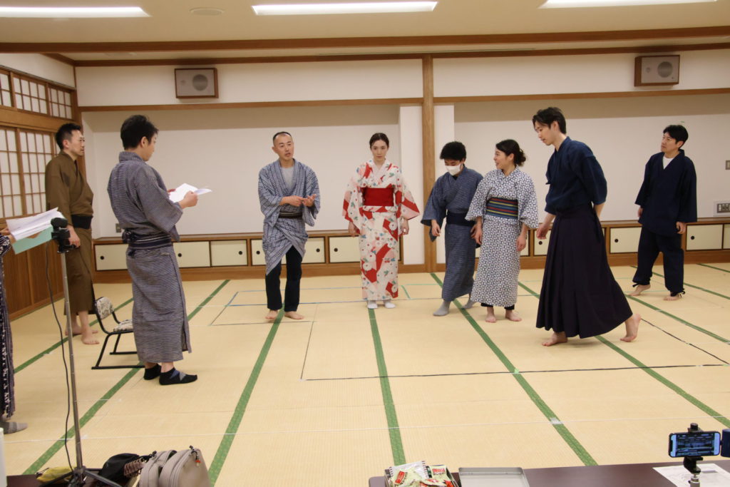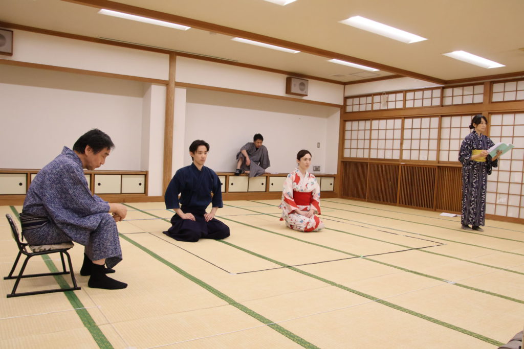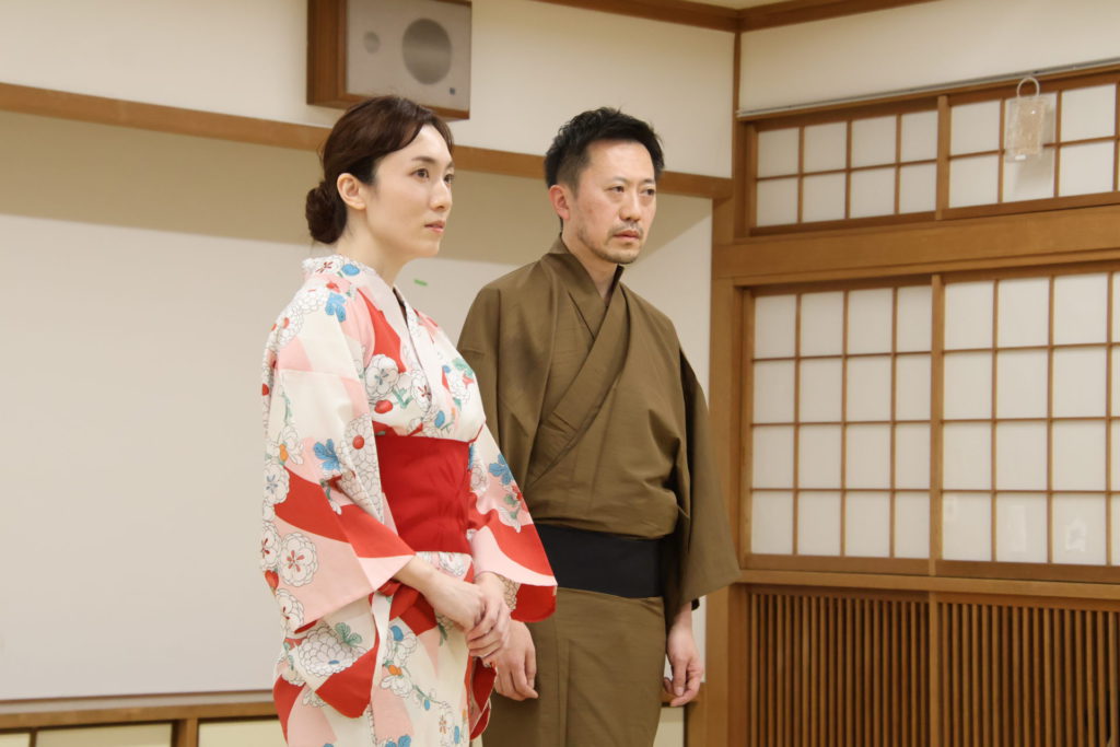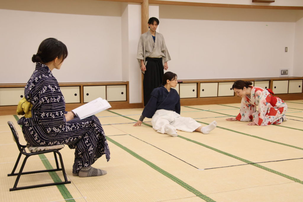 この日の稽古は、シーンを区切って動きの細部やそれぞれの心情を確認する返し稽古が行われた。取材に訪れたときには、物語が大きく動き出す第三章が行われていた。この場面は、岩牢に閉じ込められていた新九郎と多紀が対面し、自分の出自や事件の背景を知らされるシーン、そして多紀が初めて幽閉されている重興と会い、その異変に気付くという重要なシーンだ。キャストたちは和服に身を包み、和服での動き方を体に馴染ませていく。