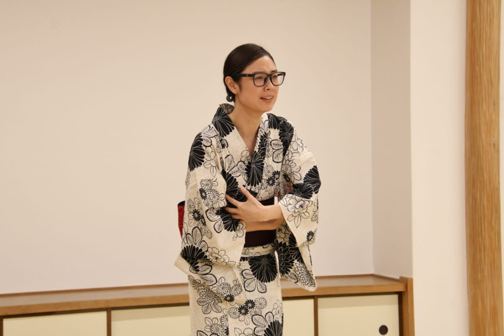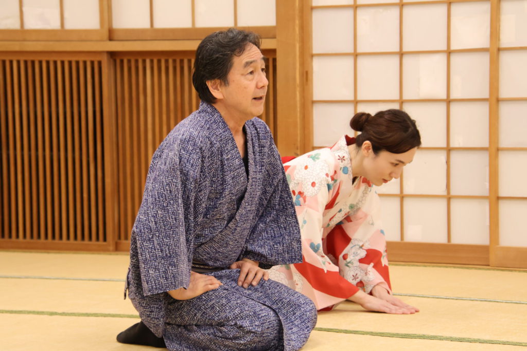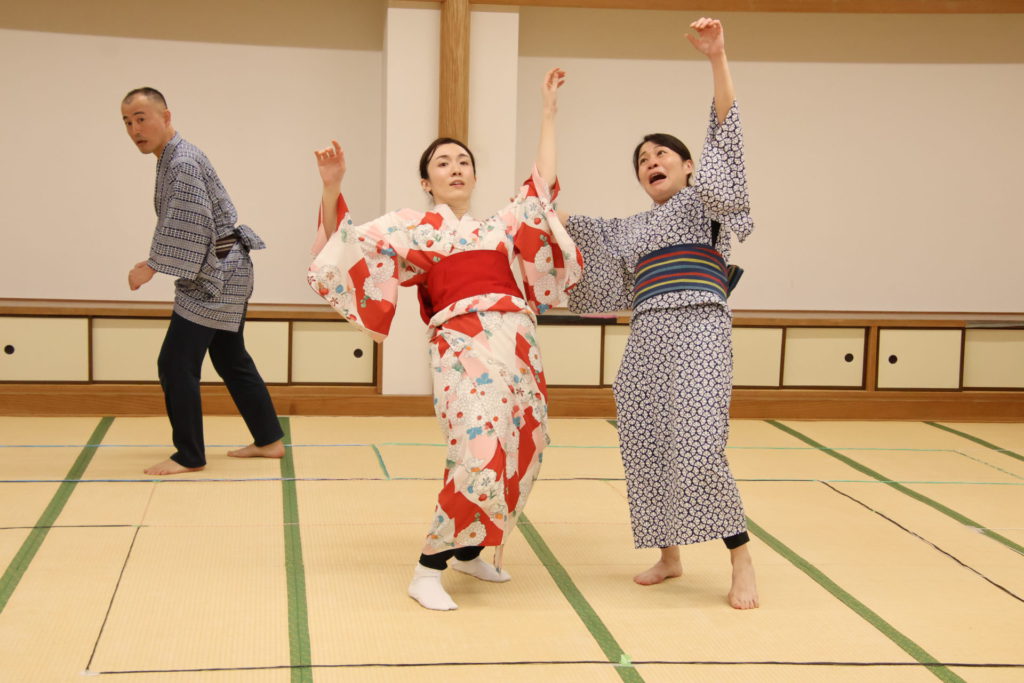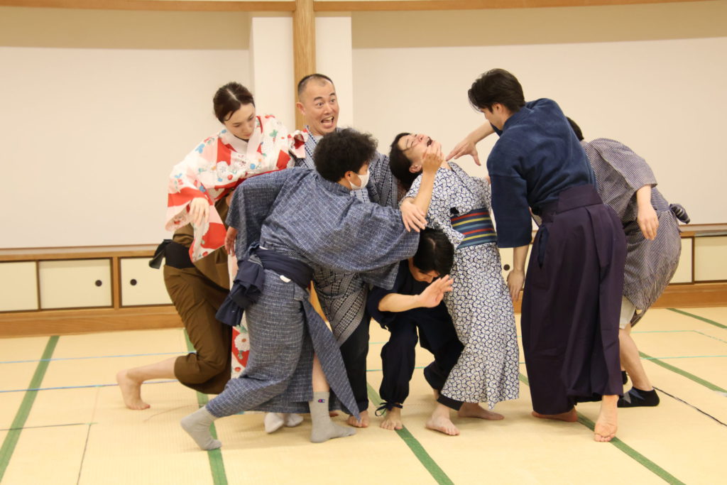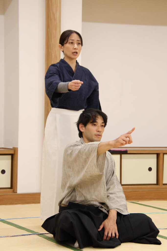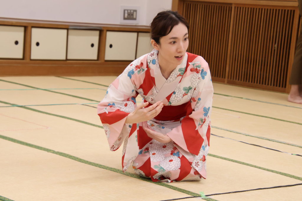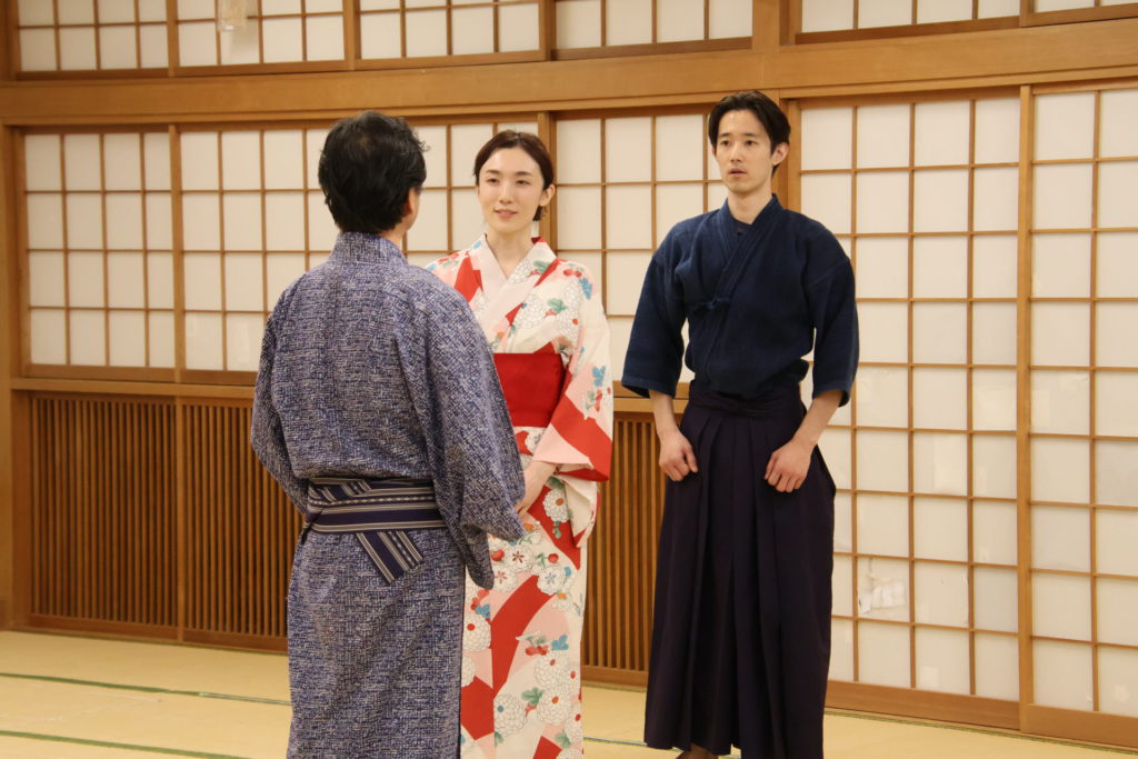 この日の稽古は、シーンを区切って動きの細部やそれぞれの心情を確認する返し稽古が行われた。取材に訪れたときには、物語が大きく動き出す第三章が行われていた。この場面は、岩牢に閉じ込められていた新九郎と多紀が対面し、自分の出自や事件の背景を知らされるシーン、そして多紀が初めて幽閉されている重興と会い、その異変に気付くという重要なシーンだ。キャストたちは和服に身を包み、和服での動き方を体に馴染ませていく。