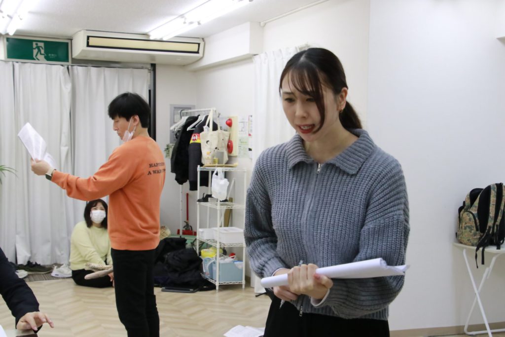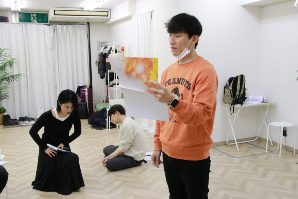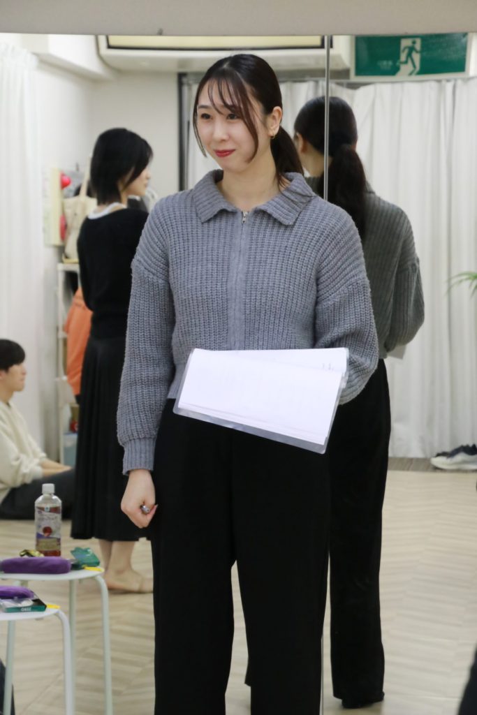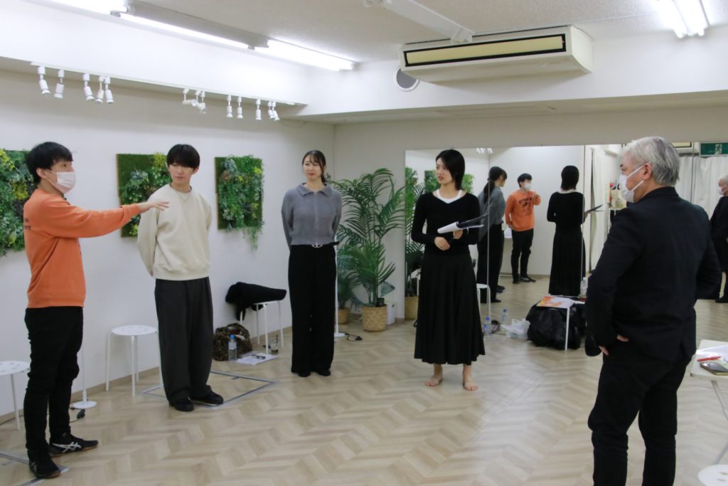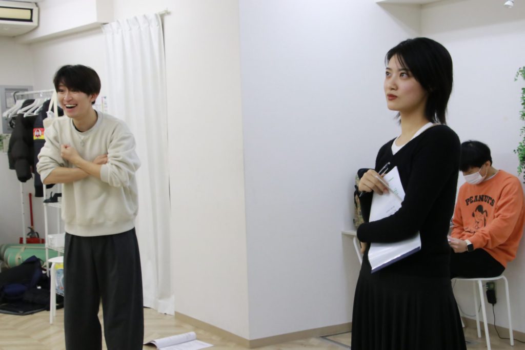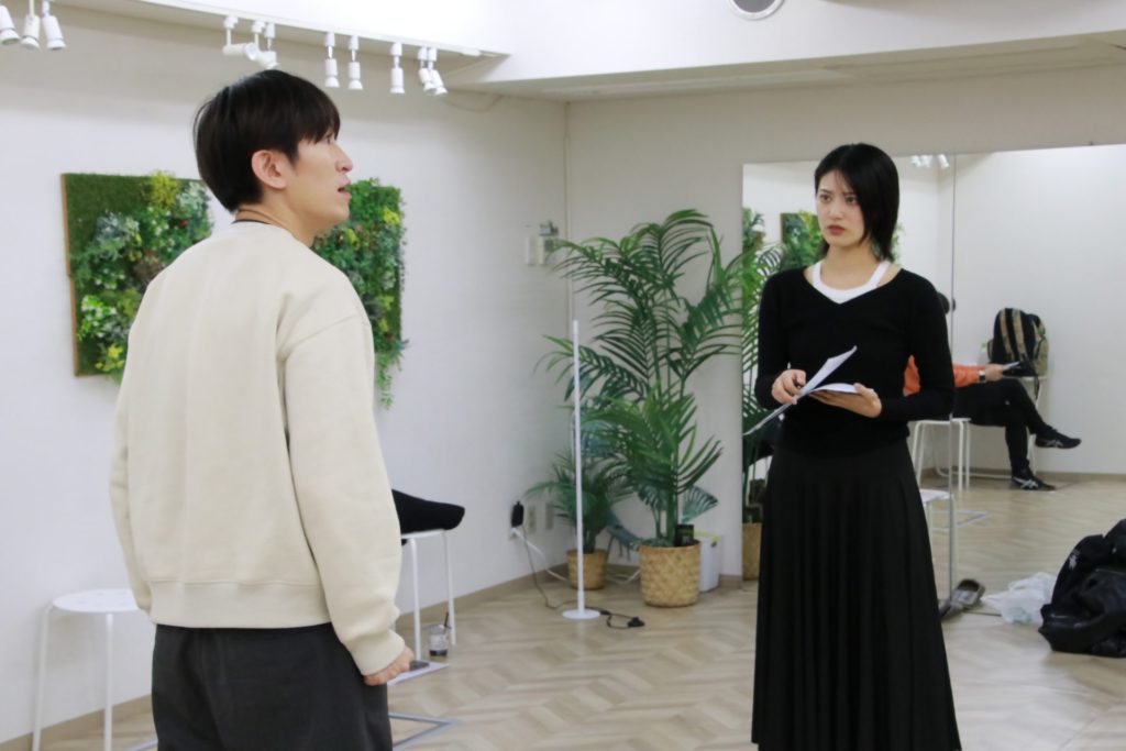 この日取材したのは、本読みを終えて、各シーンの立ち位置や上手&下手の出ハケの確認。実は取材スタッフも驚くほどの短い稽古日数で、短期間による焦りや動揺といった空気感が稽古場に包まれるのではという、取材を終えた時にはそのような心配は杞憂に過ぎなかった。