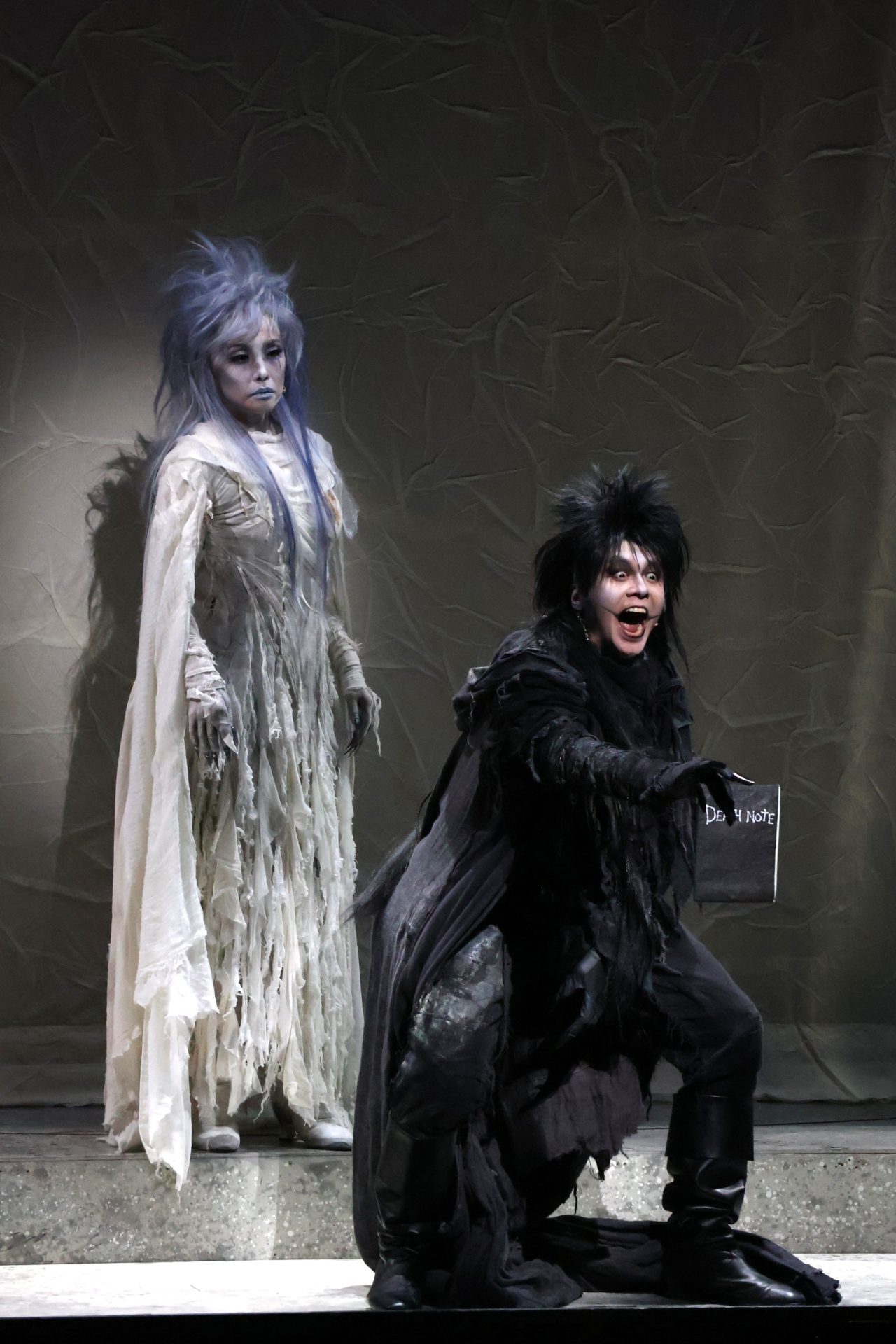 今回の2025年版上演は、そんな作品の初演から10周年となるメモリアル公演で、デスノートを偶然手にしたことで、生き方を大きく異にしていく夜神月(ライト)に加藤清史郎と渡邉蒼のWキャスト、幾多の解明不能の難事件を解決に導いてきた謎の名探偵Lに三浦宏規という清新なキャストを迎えたのをはじめ、実力派の面々が集結。わけても2015年、2017年に夜神月を演じたオリジナルキャストの浦井健治が、死神リューク役として作品に戻ってくるというメモリアル公演ならではの大きな話題と、やはりオリジナルキャストとして2015年死神レムを演じた濱田めぐみも、2017年公演以来の出演を果たすなど、10年の節目に相応しい舞台が展開されている。