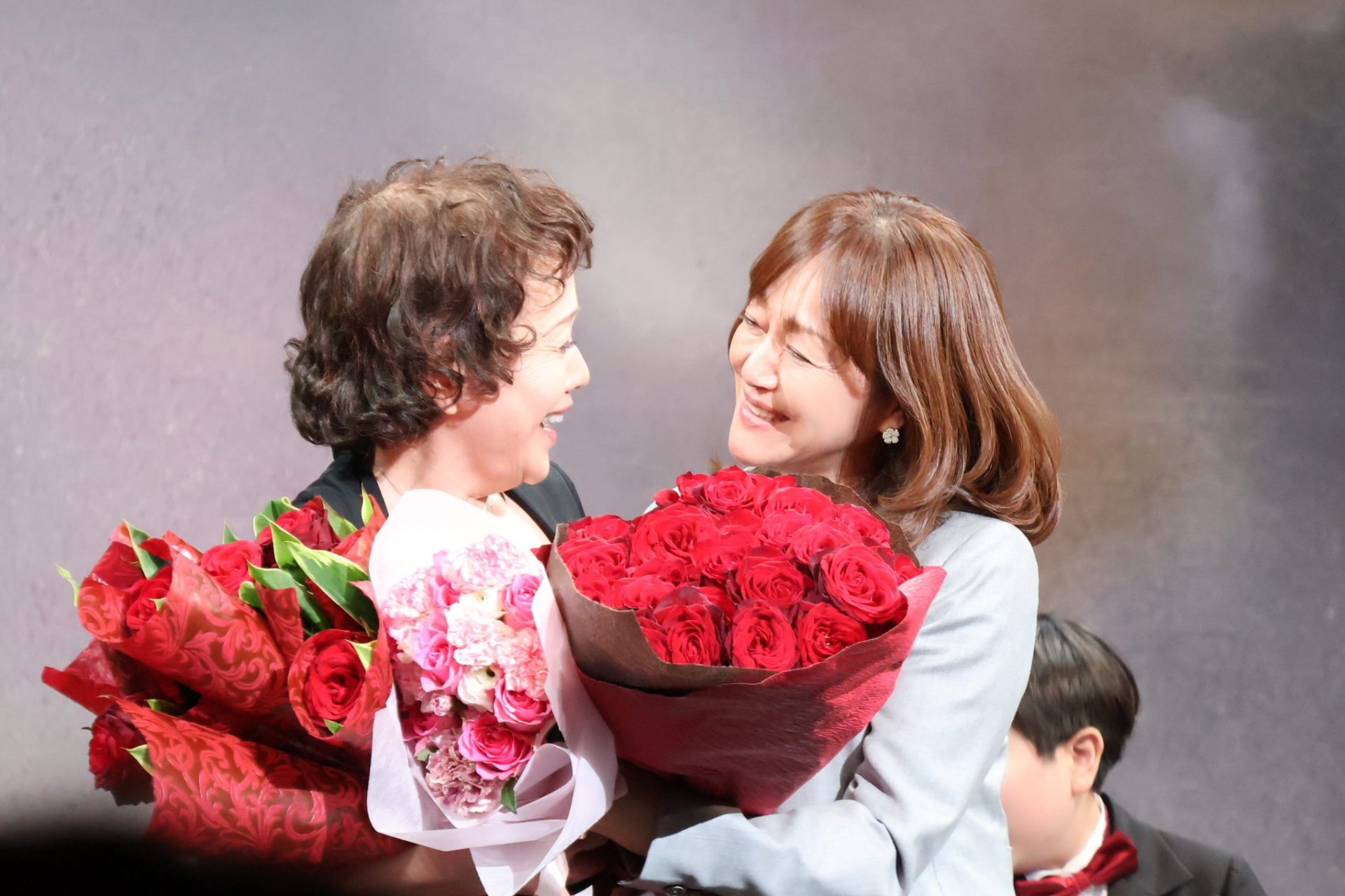 続けてもうひとりのゲストをご紹介しますとの藤岡の紹介で登場したのが、歌手の岩崎宏美。薔薇の大きな花束を渡す岩崎と受け取る大竹とは、歌う為の喉のケアや、体形維持の情報を交換しあう長年の親しい仲だそうで、そんな岩崎との関係性を説明しながら大竹は「紅白素敵だったよ」「チケット(を別日に)取ってるじゃない」などと話しかけ「秘密だったからね」と答える岩崎は、むしろ大竹本人以上なのかもと想像させるほど、この200回目の舞台に感無量の様子。涙、涙の抱擁が印象的だった。