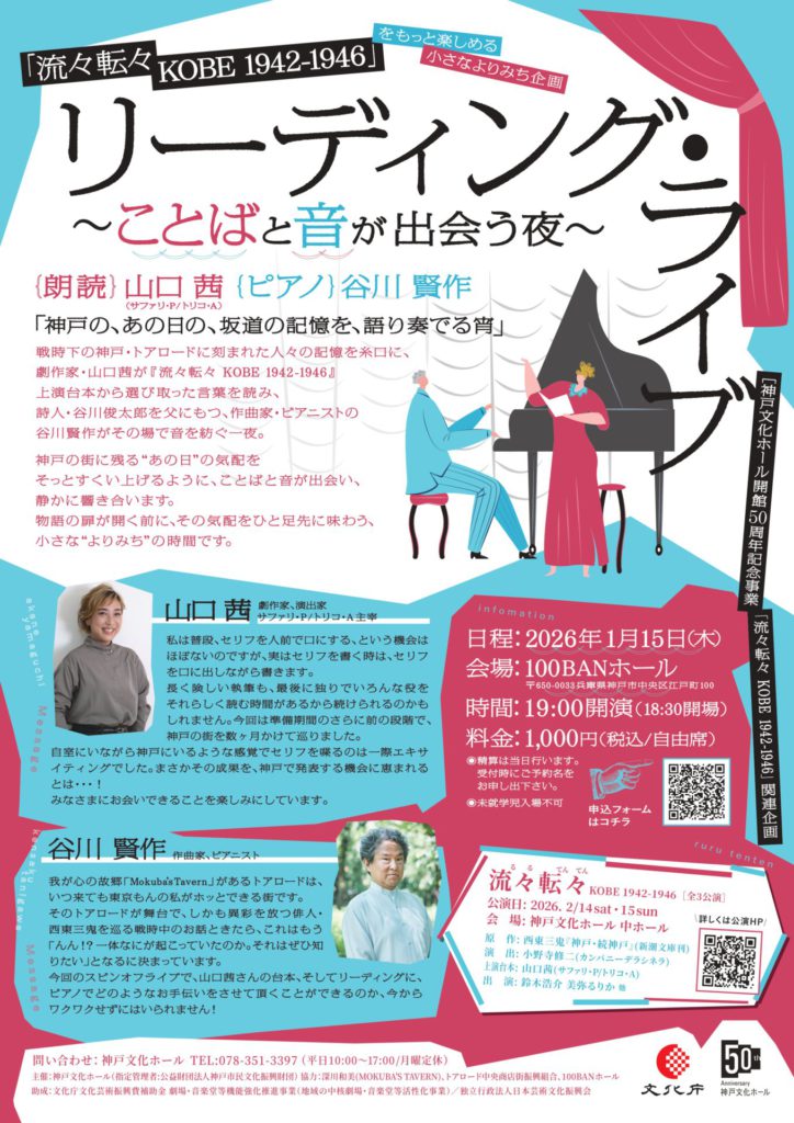 本作の脚本を担当した山口茜と、作曲家でピアニストの谷川賢作の二人によるリーディング・ライブは、”震災の日”まであと2日という1月15日の夜、旧居留地の高砂ビル内の100BANホールで行われた。