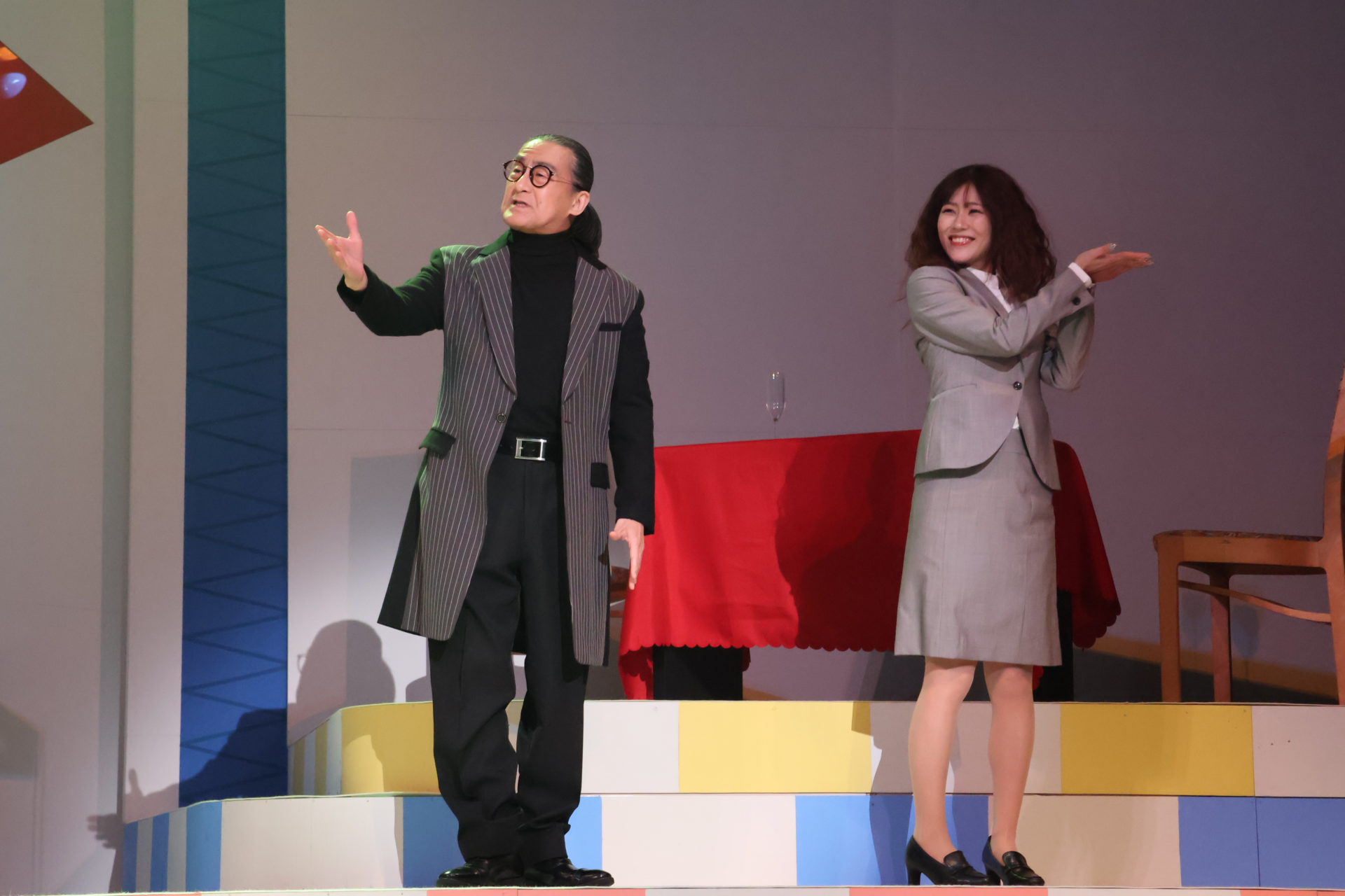 そして、今回の客演のゴージャス感を一気に高めているのが真の秘書、涼風匠(すずかぜ・たくみ)として登場した粟根まこと。この役柄のとある設定も、梢同様、どうやって思いつくの!?と半ば呆れるほどだし(だから、褒めている)、おそらく役者に相当な力量がないとかなりの確率で滑る危険に満ちているのだが、平然と笑いにつなげるのは粟根あってこそ。その笑いのなかから真への誠実さもきちんと見せていて、作品にとっても大きなカードになっている。