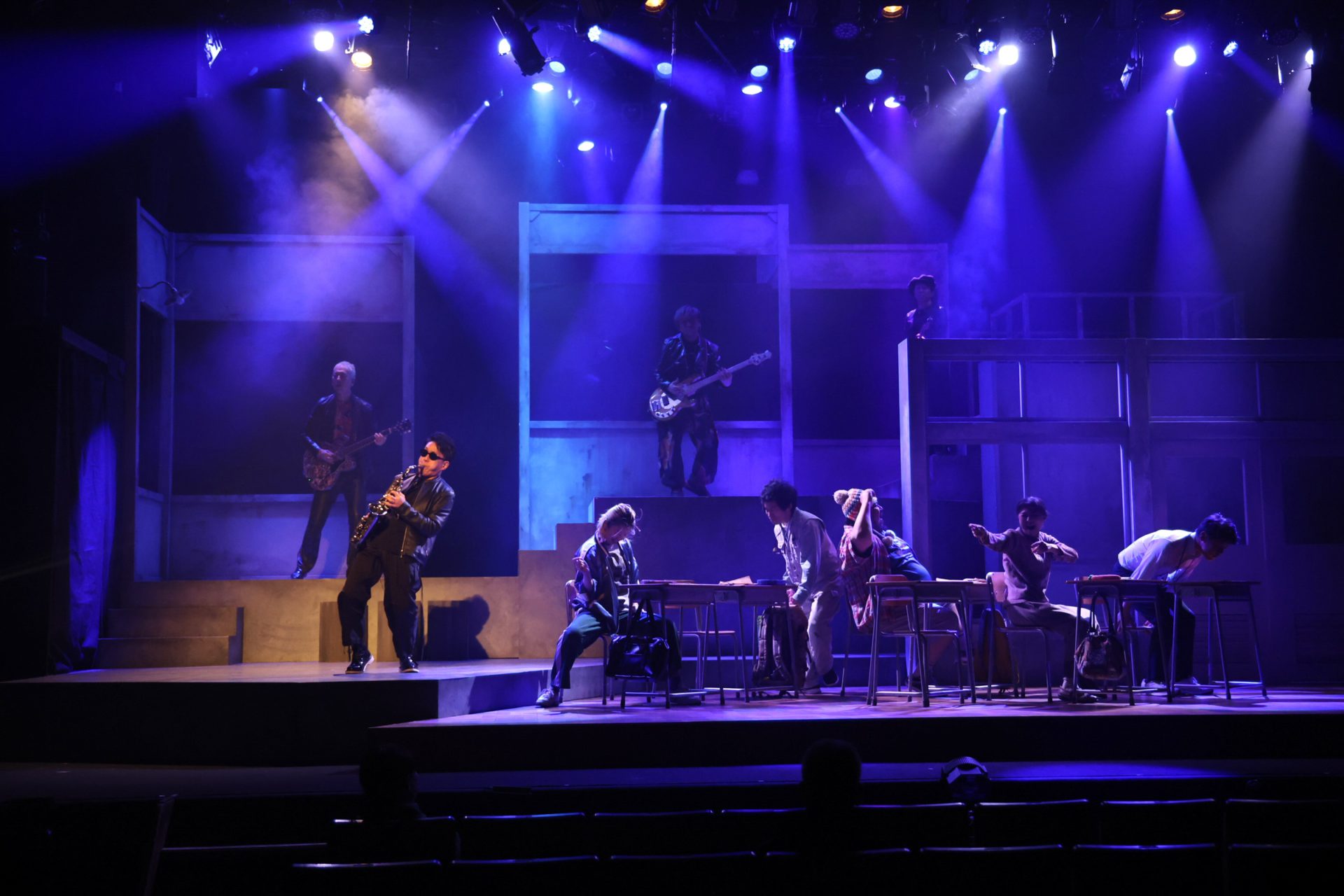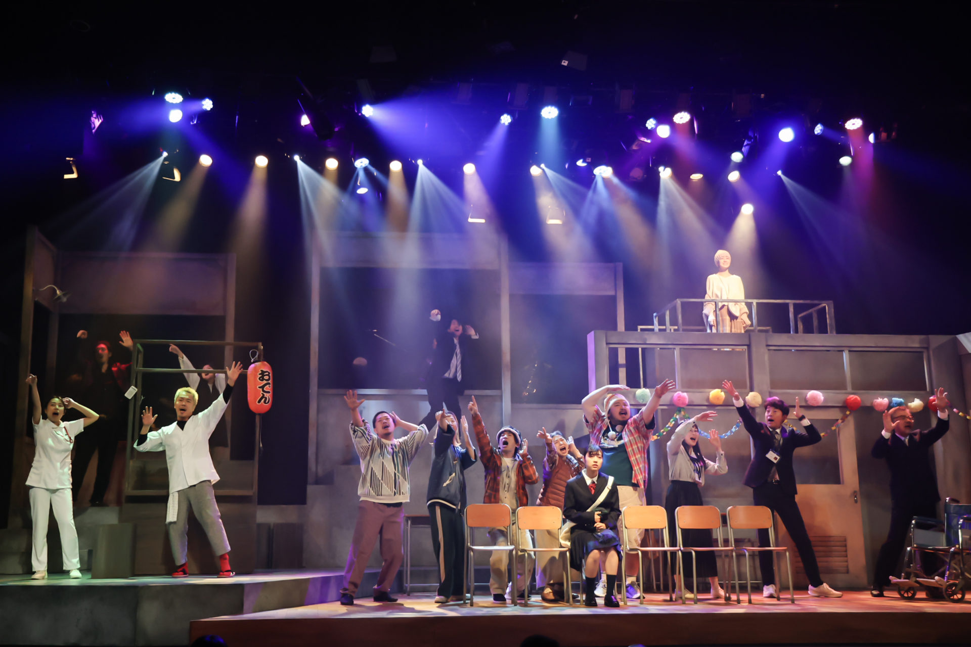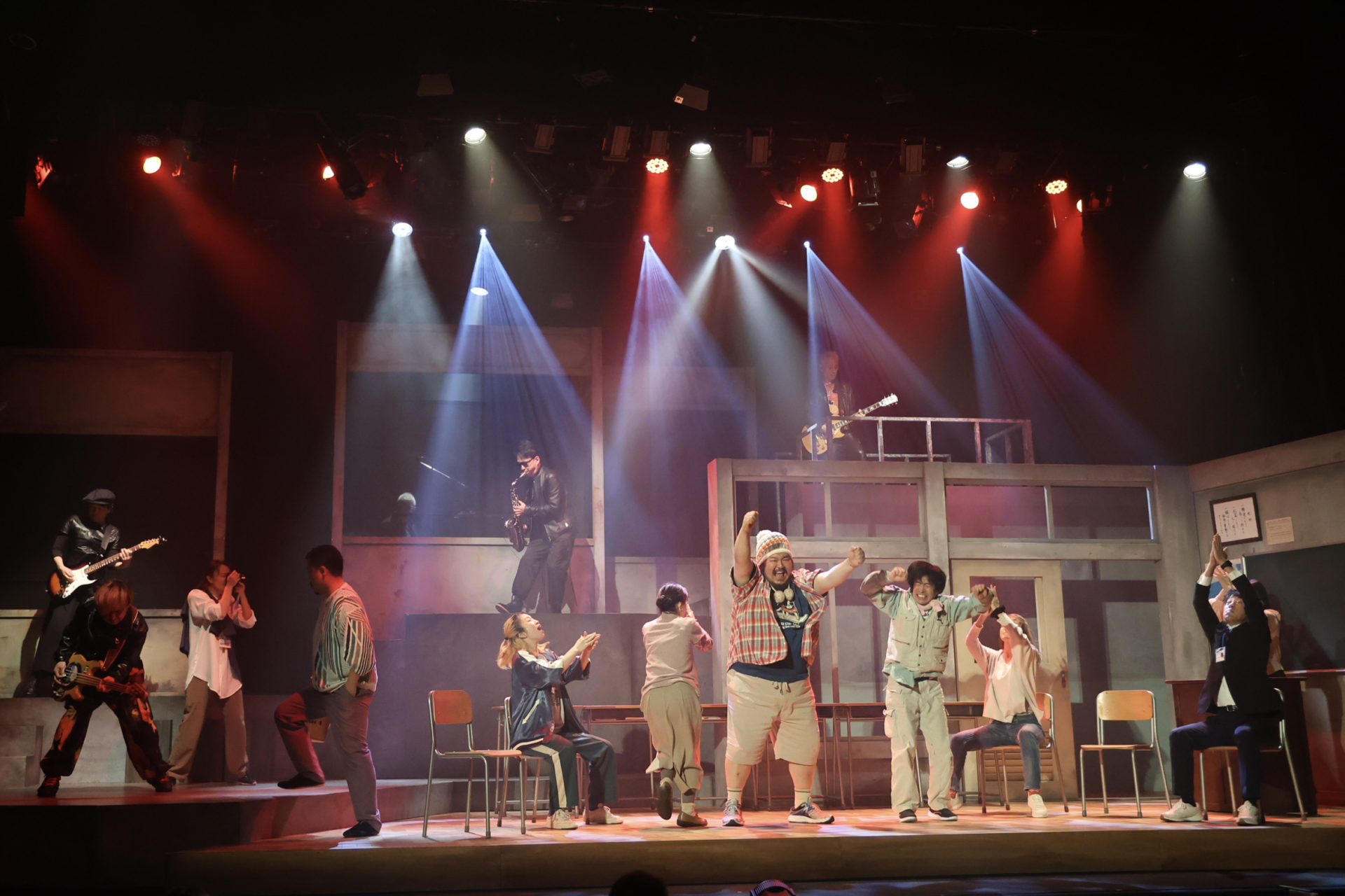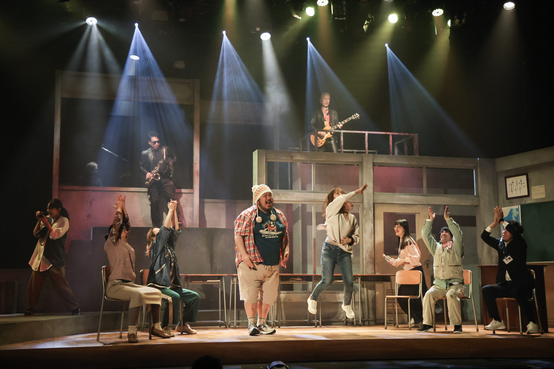 ここでバンドの生演奏が始まる。エレキギターとサックスの音に「狼少年ラジオ」のジングルが鳴り響き、学校のセットにスポットライトが当たると、夜間中学で学ぶ生徒たちが踊り出す。