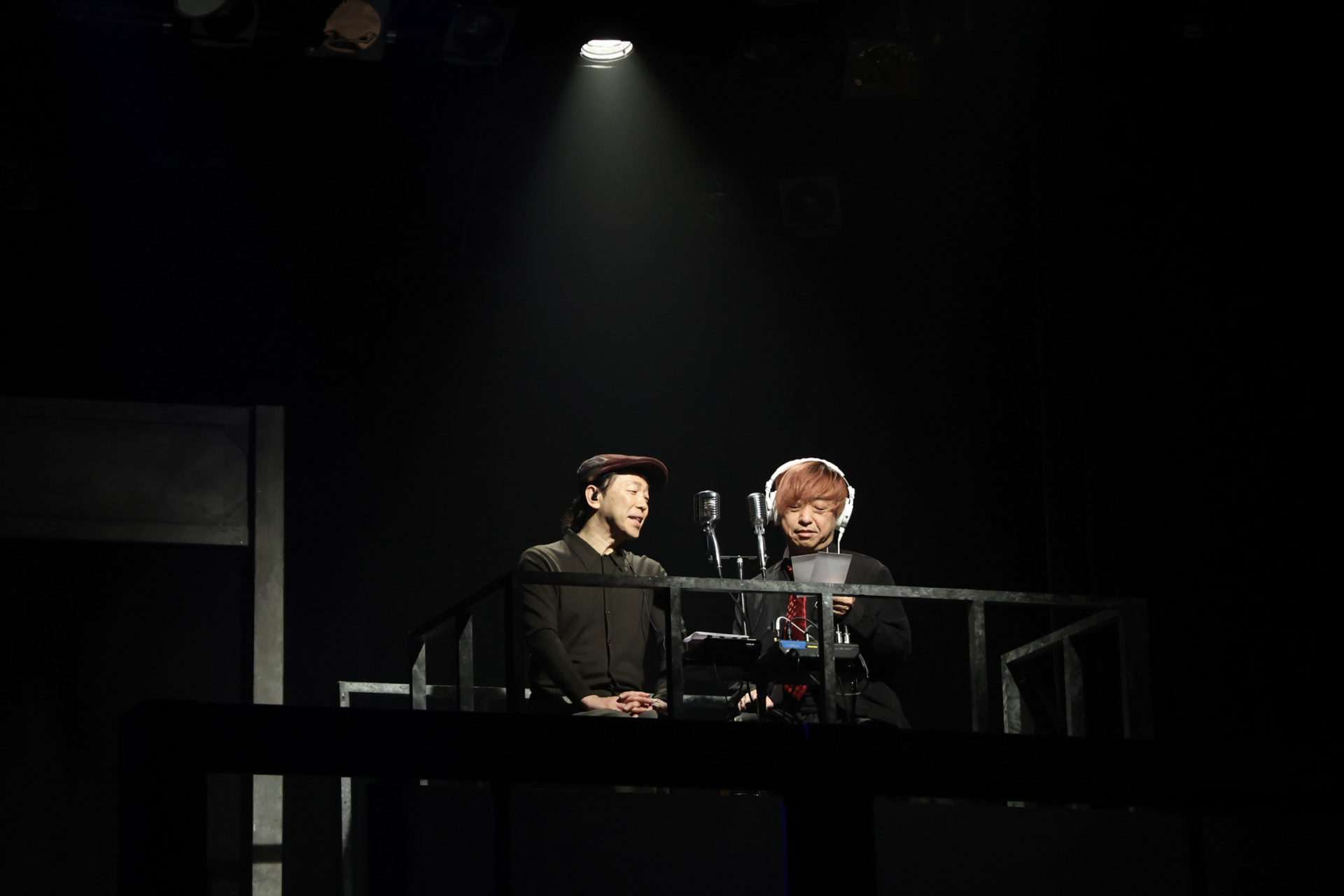 筆者は前日の18日に行われたゲネプロを観た。事前に「ぜひ開演の10分前にお越しください」とのメールをもらっていた。実際に上演時間の10分前になると、舞台右上にラジオブースが現れた。パーソナリティーは、今作の楽曲制作を担当する田中直樹と沼井雅之の二人だ。実際にエフエム世田谷で番組を持っていて、その公開生放送が行われているという体だ。