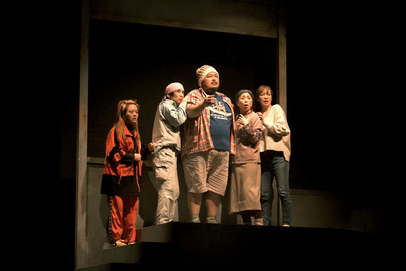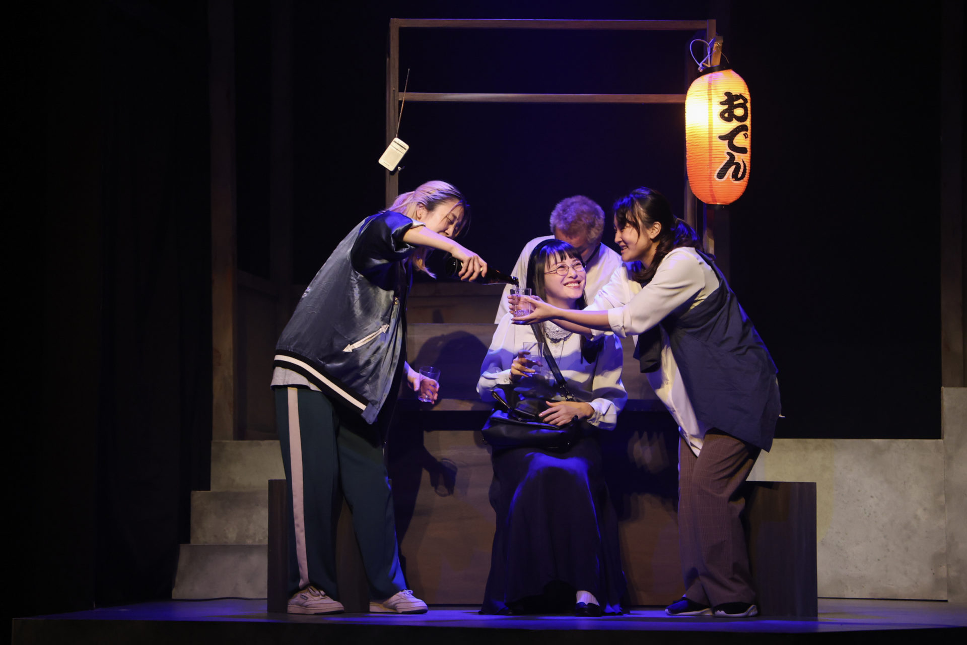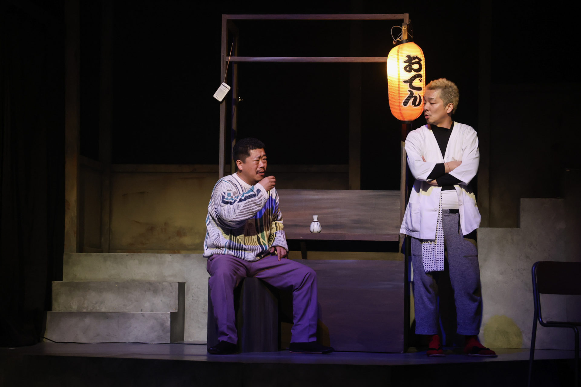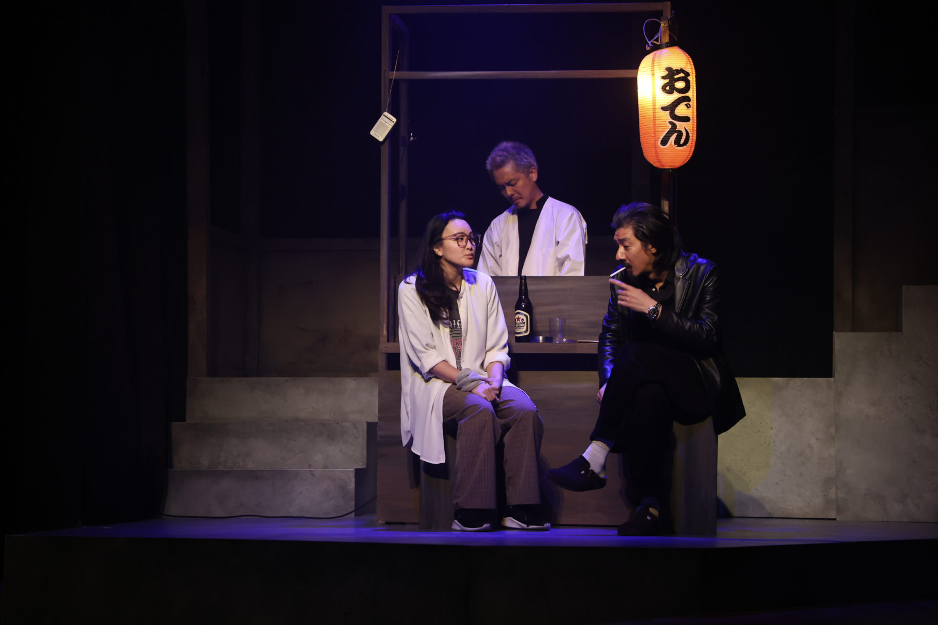 舞台上の左端には、おでん屋台のセットが組まれ、おでん屋の大将(實川阿季)とガラの悪そうなパンチパーマの男性客、角田玄太(奥津裕也)が話している。昼間からおでん屋台でぶらぶらしている角田には職がないようだ。